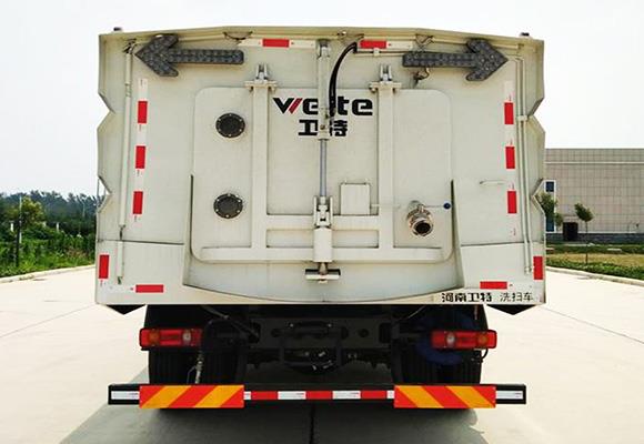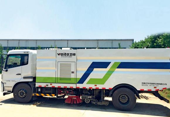 Street sweeping lastbil er ansat til at feje bygader og samle vrøvl på vejen. Den fejende skive er monteret midt på truckens chassis, og der er sugedyser bag på køretøjet.